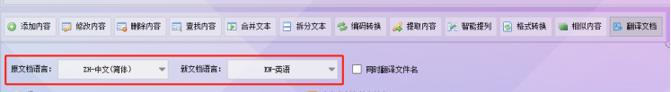 7.配置翻译参数:选择"翻译文档"功能,设置原语言为中文(简体),目标语言为英语。