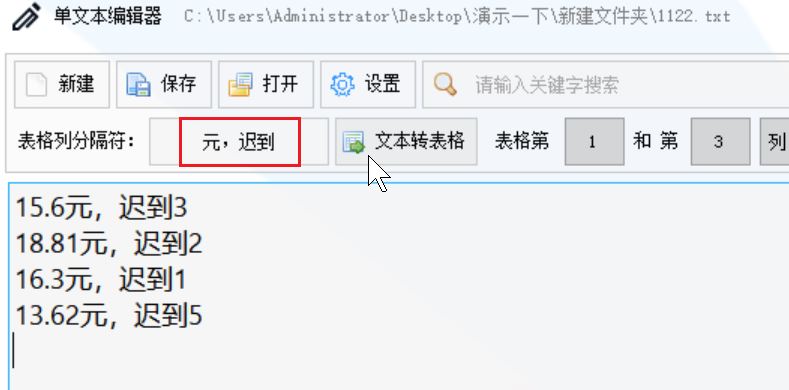 4、进入“单文本编辑器”,打开刚保存的txt文件,在表格列分隔符中输入“元,迟到”,然后点“文本转表格”,如图: