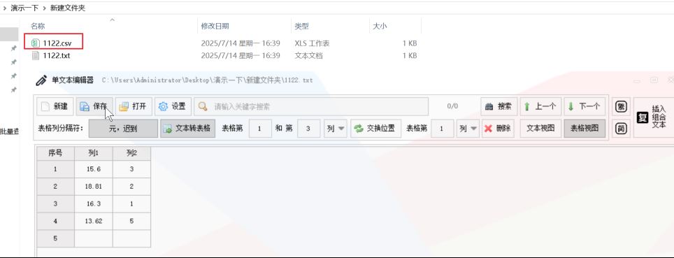 6、点击“保存”以后,在txt保存位置会自动生成一个csv表格文件(如果没有生成,要在设置中打勾“保存文本的同时再保存一个同名表格文档”选项),如图:
