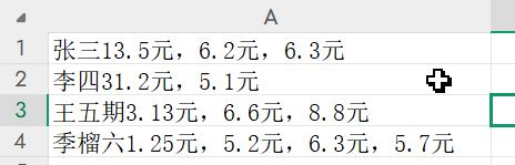 1、本案例的难点为姓名中渗合数值,而姓名的文字没有规则,如果是“单价:15.33元、单价:16.10元”这种有规律的,可以直接用EXCEL的分列功能,分隔符用冒号隔开或固定宽度隔开就可以实现。
