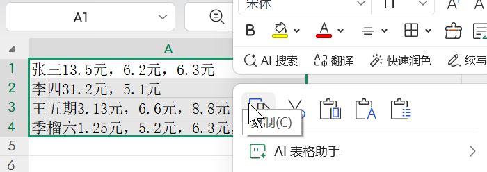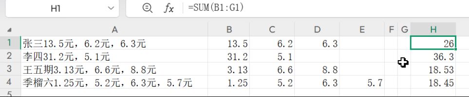 针对"姓名+多笔奖金金额"的不规则文本数据(如"张三3.5元,6.2元,6.3元"),传统表格工具难以直接计算个人奖金总额。