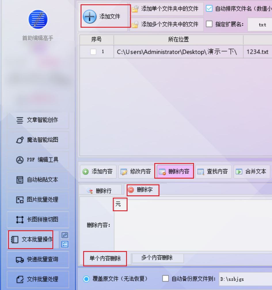 4、进入“文本批量操作”菜单,添加刚保存的txt文件,再进入“删除内容”功能,在“删除字”中输入“元”并选择“覆盖原文件”来删除,如图: