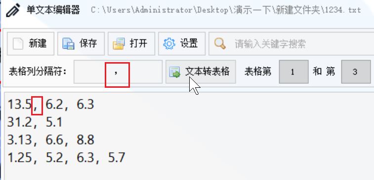 5、删除单位“元”后,进入“单文本编辑器”,打开刚编辑的txt文件,输入表格列分隔符后点“文本转表格”按钮,如图: