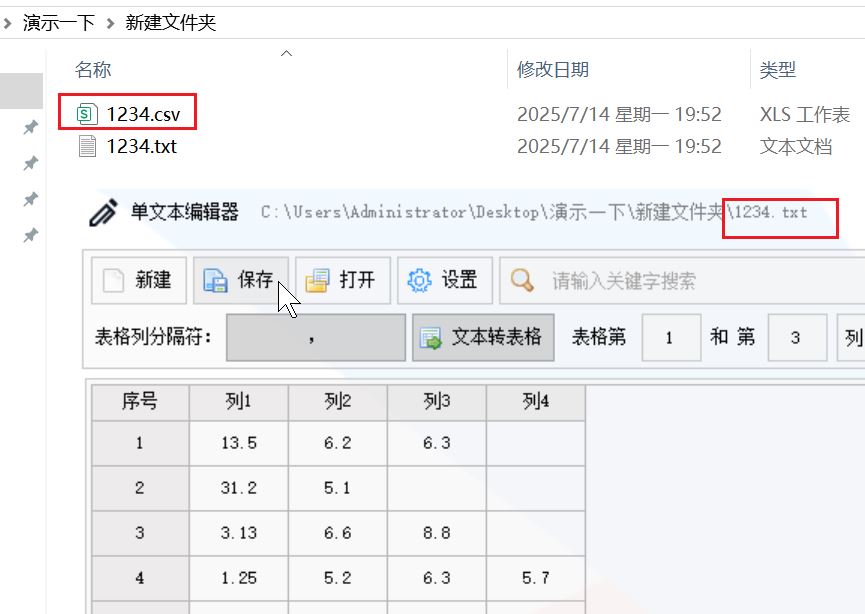 5、点击“保存”以后,在txt保存位置会自动生成一个csv表格文件(如果没有生成,要在设置中打勾“保存文本的同时再保存一个同名表格文档”选项),如图: