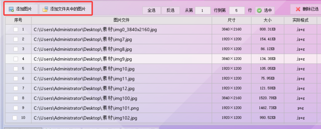 2、点“添加图片”或点“添加文件夹中的图片”,把我们要转换格式的图片添加进来,如图: